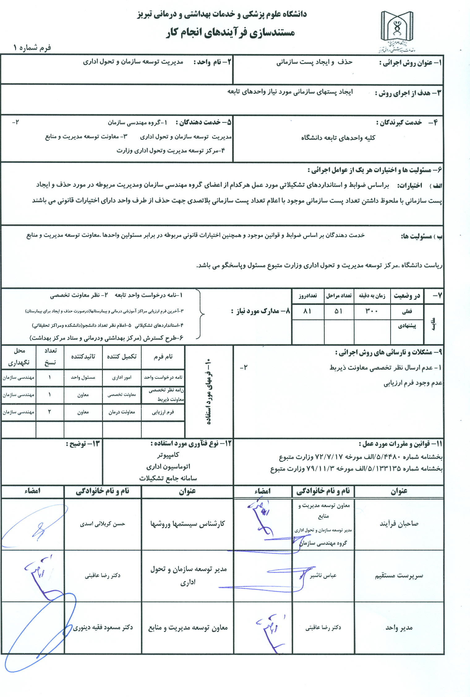 - مستندسازی فرایند انجام کار - نمودار گردش کار -نمودار جریان کار - فرم تجزیه و تحلیل اطلاعات -جدول مقایسه وضعیت فعلی و پیشنهادی مستندات : - 791103-حذف وايجاد پست مستلزم ارزيابي بيمارستان - 720727-ايجاد هرگونه پست در مقابل حذف پست
